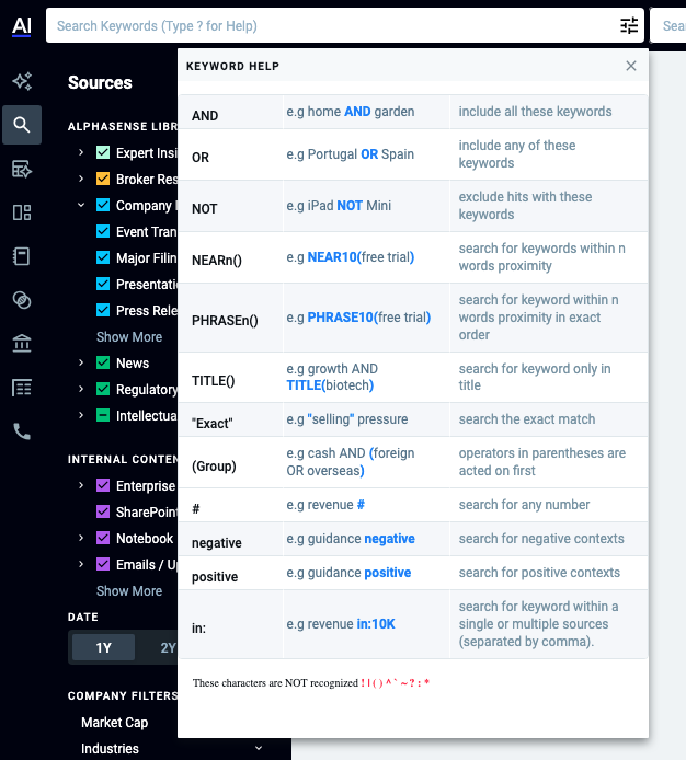 The keyword search bar supports Boolean logic (AND, OR, NOT, NEAR, PHRASE). To see a full list of Boolean operators, enter a question mark ( ? ) into the keyword search bar.