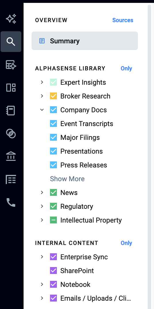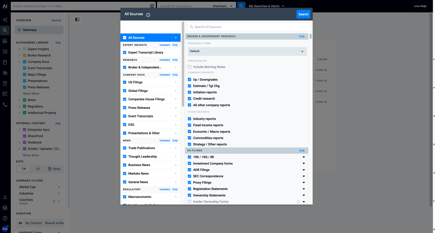 The Sources menu is the most comprehensive way to filter content in AlphaSense and is available across multiple workflows.