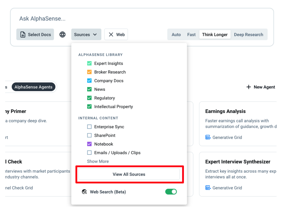- Click View All Sources to open the full Sources menu, where you can search and filter content with greater precision.