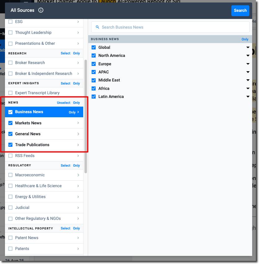 - Select Business News, Markets News, General News, and Trade Publications