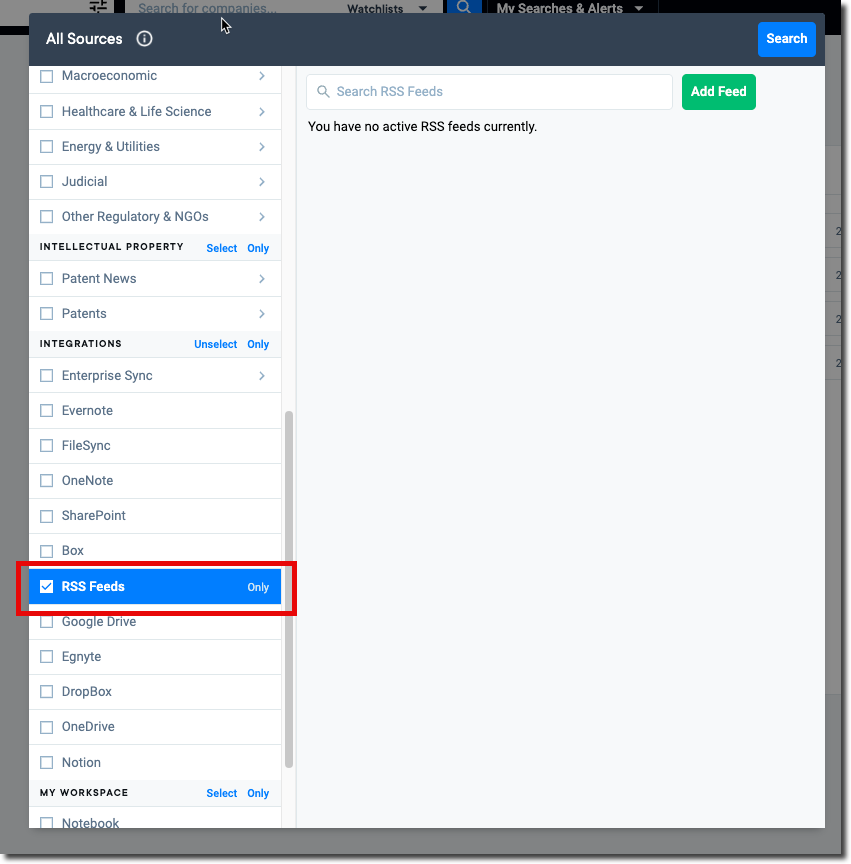 Additionally, you can manually add your own RSS Feeds into the platform that AlphaSense may not currently be uploading. You can upload RSS feeds to fill content gaps and search alongside internal and premium external content.