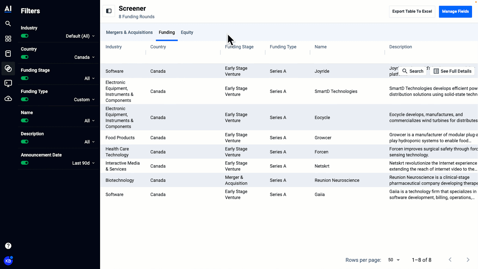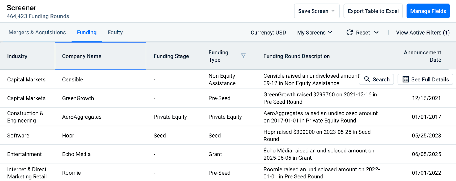 After selecting the fields that you would like to add from “Manage Fields”, you can customize the filters from the column header. The Funding tab can then be leveraged to see what companies and funding rounds match your desired criteria.