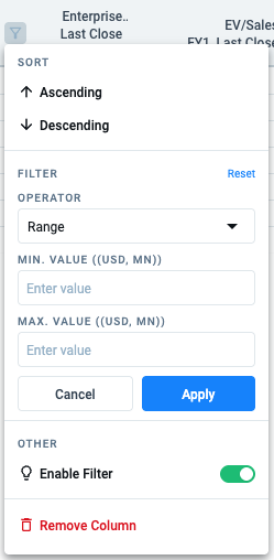 After selecting the fields that you would like to add from “Manage Fields”, you can customize the filters from the column header. The Equity tab can then be leveraged to see what what public companies match your desired criteria.