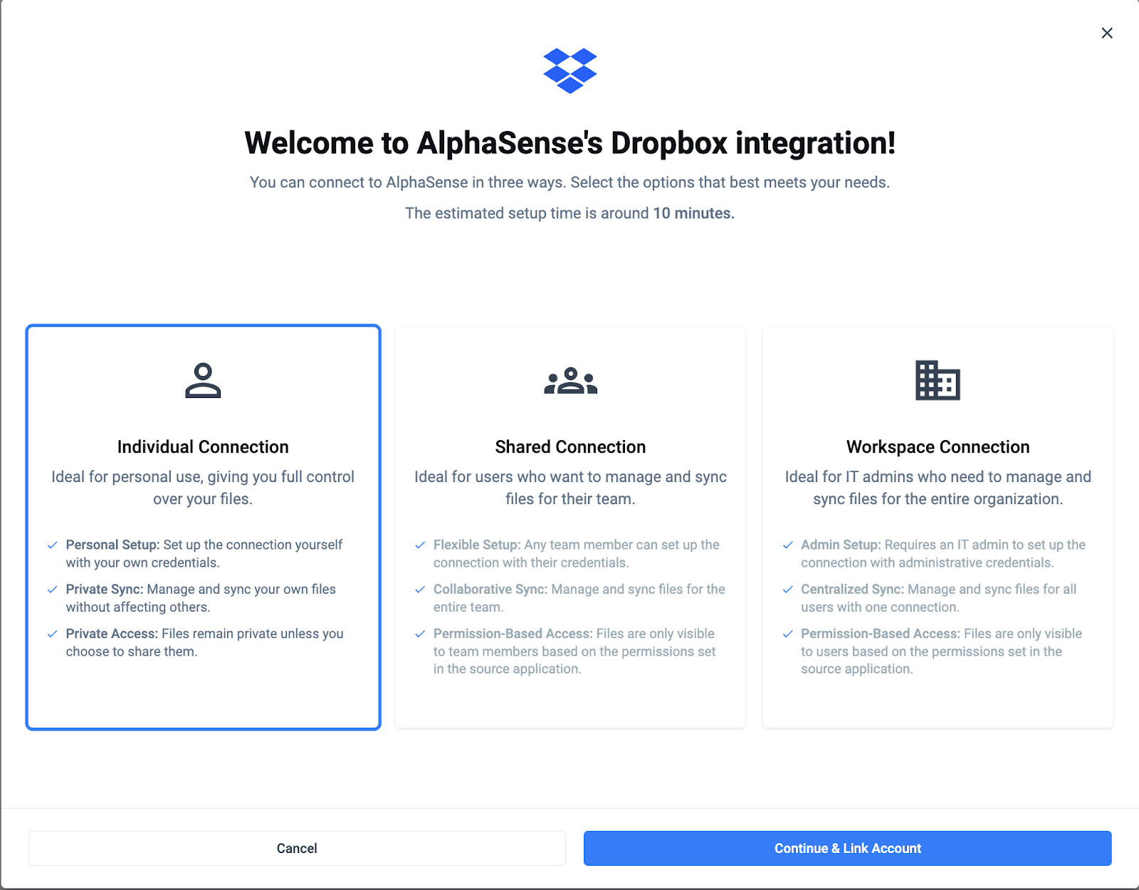 - AlphaSense supports Individual and Shared Dropbox connections.