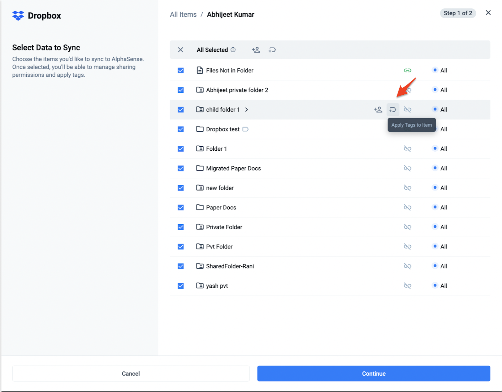 During setup, you'll configure Dropbox to sync selected files and folders for search and analysis in AlphaSense.