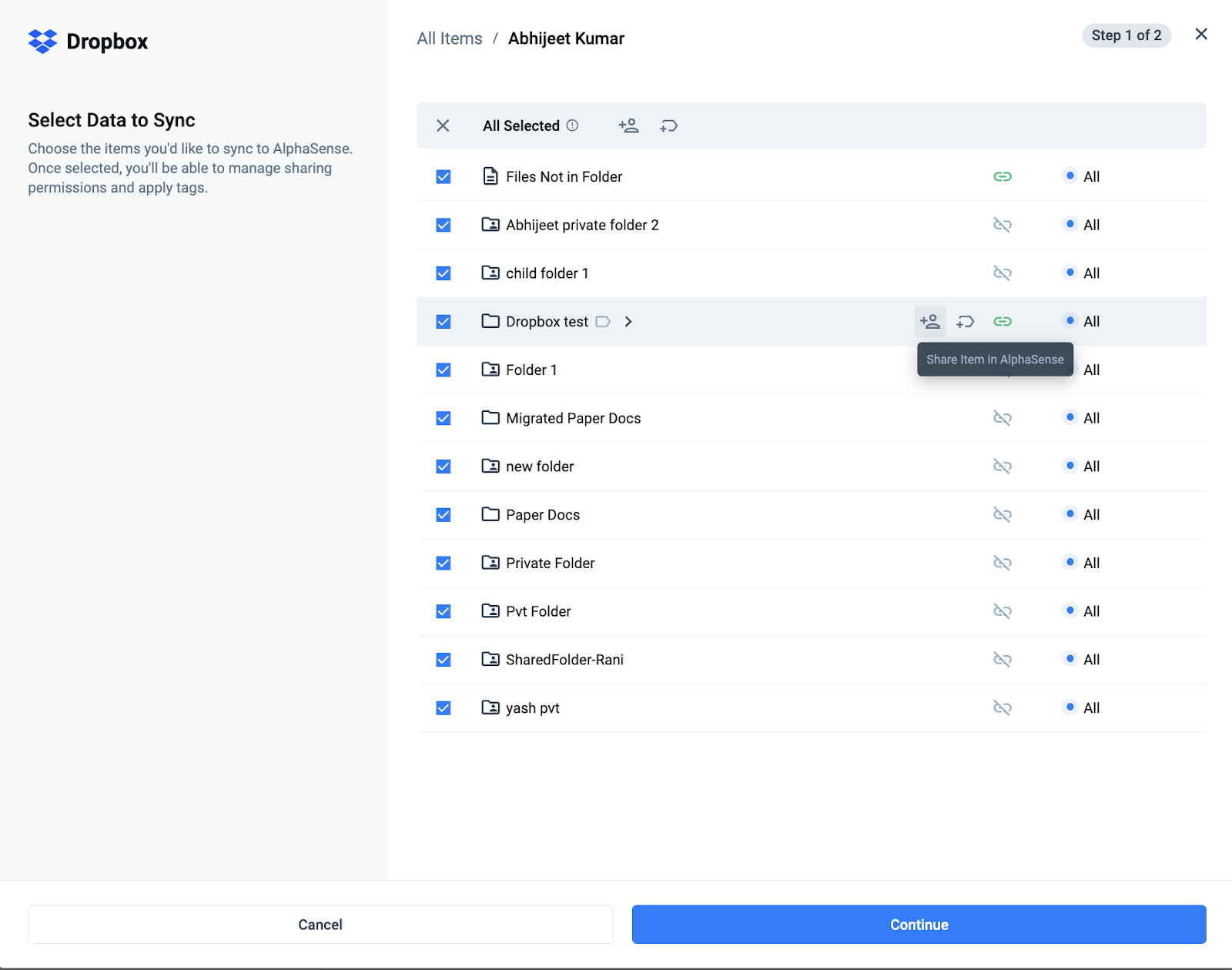 Note: AlphaSense cannot override permissions for Shared Connections. If a user doesn’t have access in Dropbox, they won’t have access in AlphaSense.