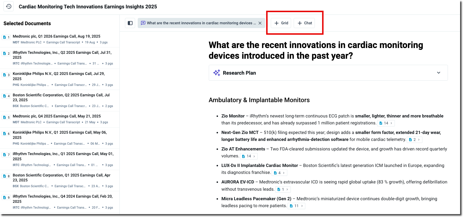 - Integrated AI Tools: Use Generative Search to chat directly with your curated document set for fast, tailored insights, and use Generative Grid to interrogate each document with guided prompts that summarize and extract key findings.