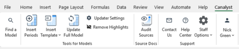 - In Excel, navigate to the Canalyst Add-In, and you'll find the updater in the ribbon if installed