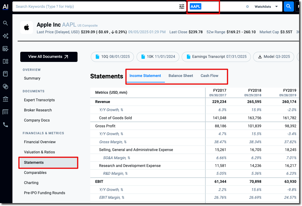 Statements: view Income Statements, Balance Sheets, and Cash Flow Statements.