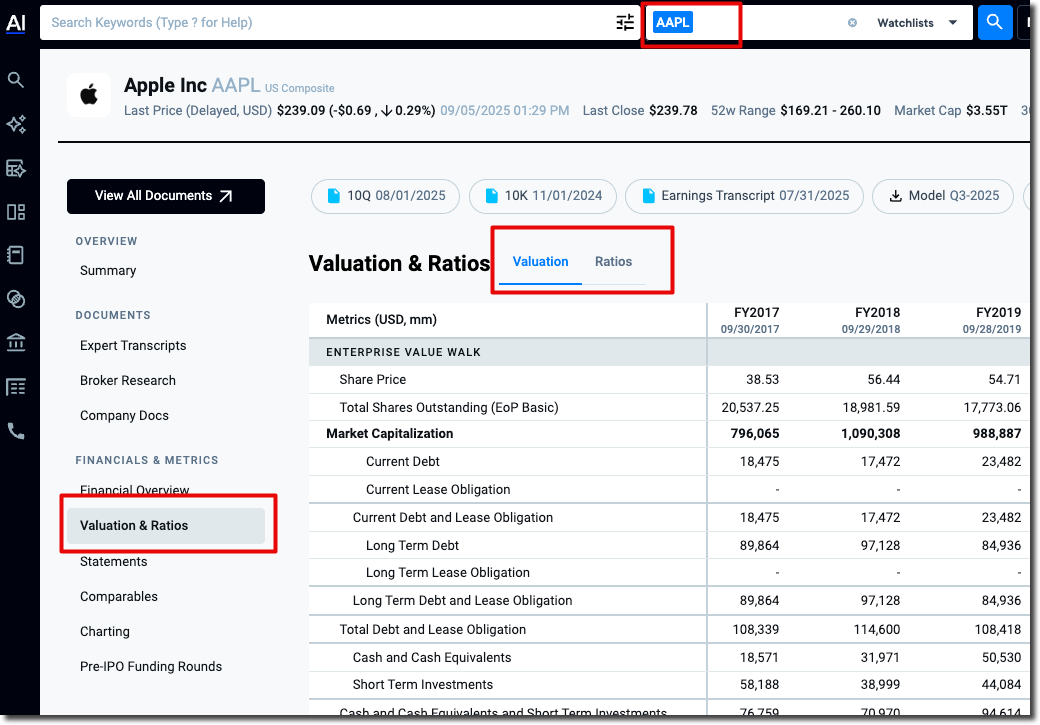 - Valuation & Ratios: explore financial ratios and valuation metrics.