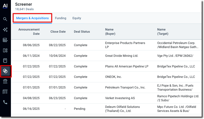- Click on the Mergers & Acquisitions tab from the Screener Homepage.