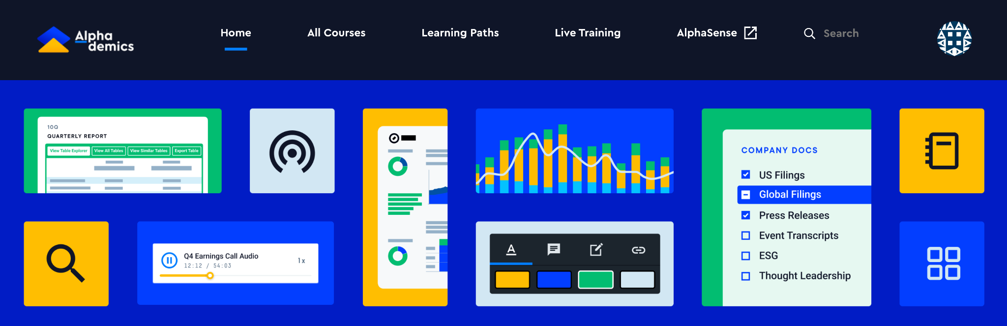 Alphademics is our dedicated training platform, of no additional cost, where you can discover and learn every way AlphaSense can improve your work and drive better results.